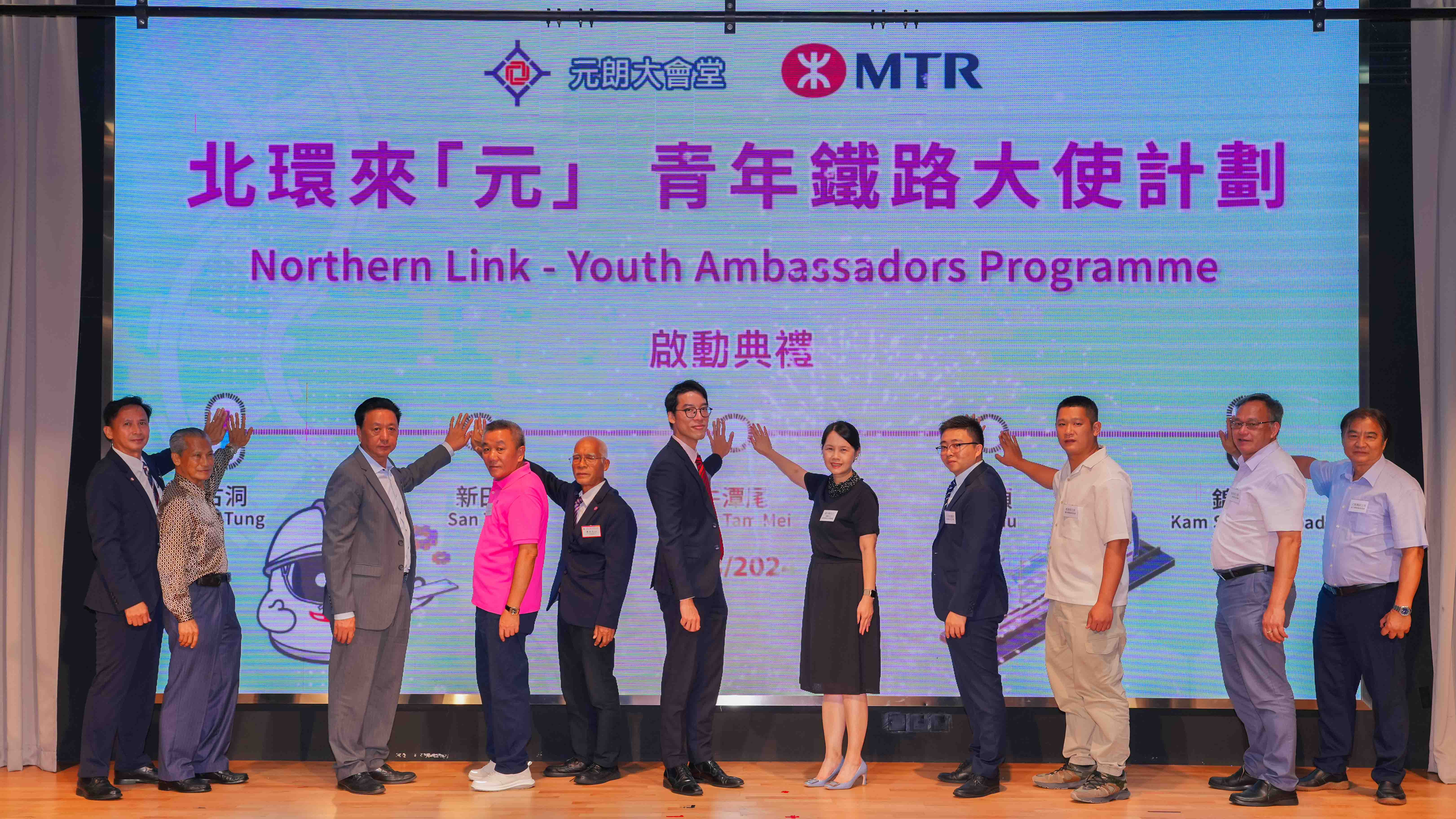 Mr Wu Tin-yau, Gordon, JP, District Officer of Yuen Long District Office, Home Affairs Department (6th left); Mr Wang Ke-sheng, Deputy Director of New Territories Sub-office, Liaison Office of the Central People's Government in the Hong Kong Special Administrative Region (4th right); Ms Linda Choy, Corporate Affairs and Branding Director of MTR Corporation (5th right); Mr Wong Dar-nin, Chairman of the Yuen Long Town Hall Management Committee (5th left); Mr Tang Koon-yau, Executive Committee Member of Pat Heung Rural Committee (2nd left); Mr Man Kwai-sau, Vice-chairman of San Tin Rural Committee (1st right); Mr Tang Ho-nin, MH, Chairman of Kam Tin Rural Committee (4th left); Mr Tang Sin-hang, Chairman of Ha Tsuen Rural Committee (3rd right); Mr Tang Che-keung, MH, Chairman of Ping Shan Heung Rural Committee (3rd left); Mr Ching Chan-ming, Chairman of Shap Pat Heung Rural Committee (2nd right) and Mr Charles Lau, Project Manager - Northern Link (Station, Depot and Spur Line) (1st left) officiated at the kick-off ceremony, indicating the official commencement of the Northern Link – Youth Ambassadors Programme.