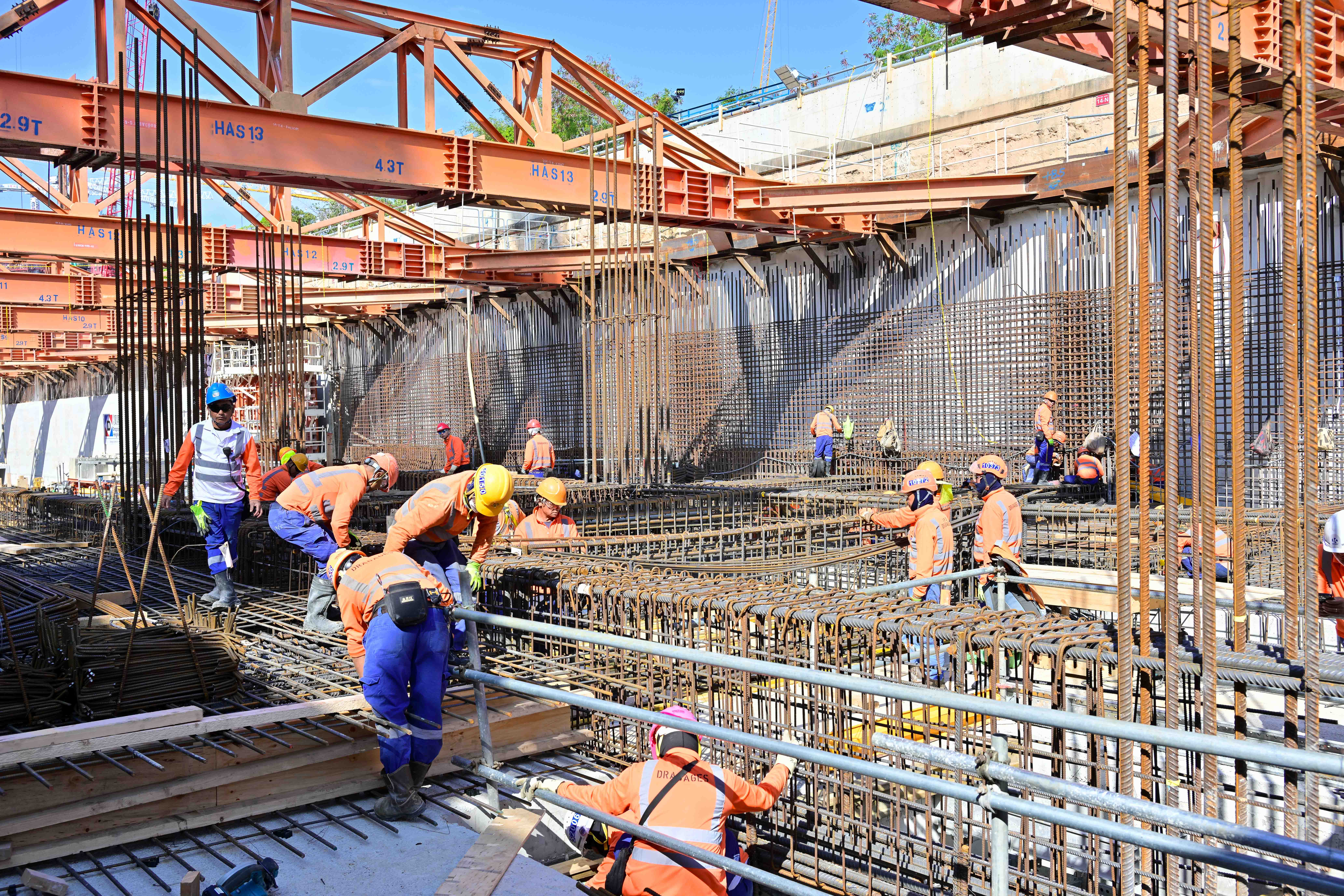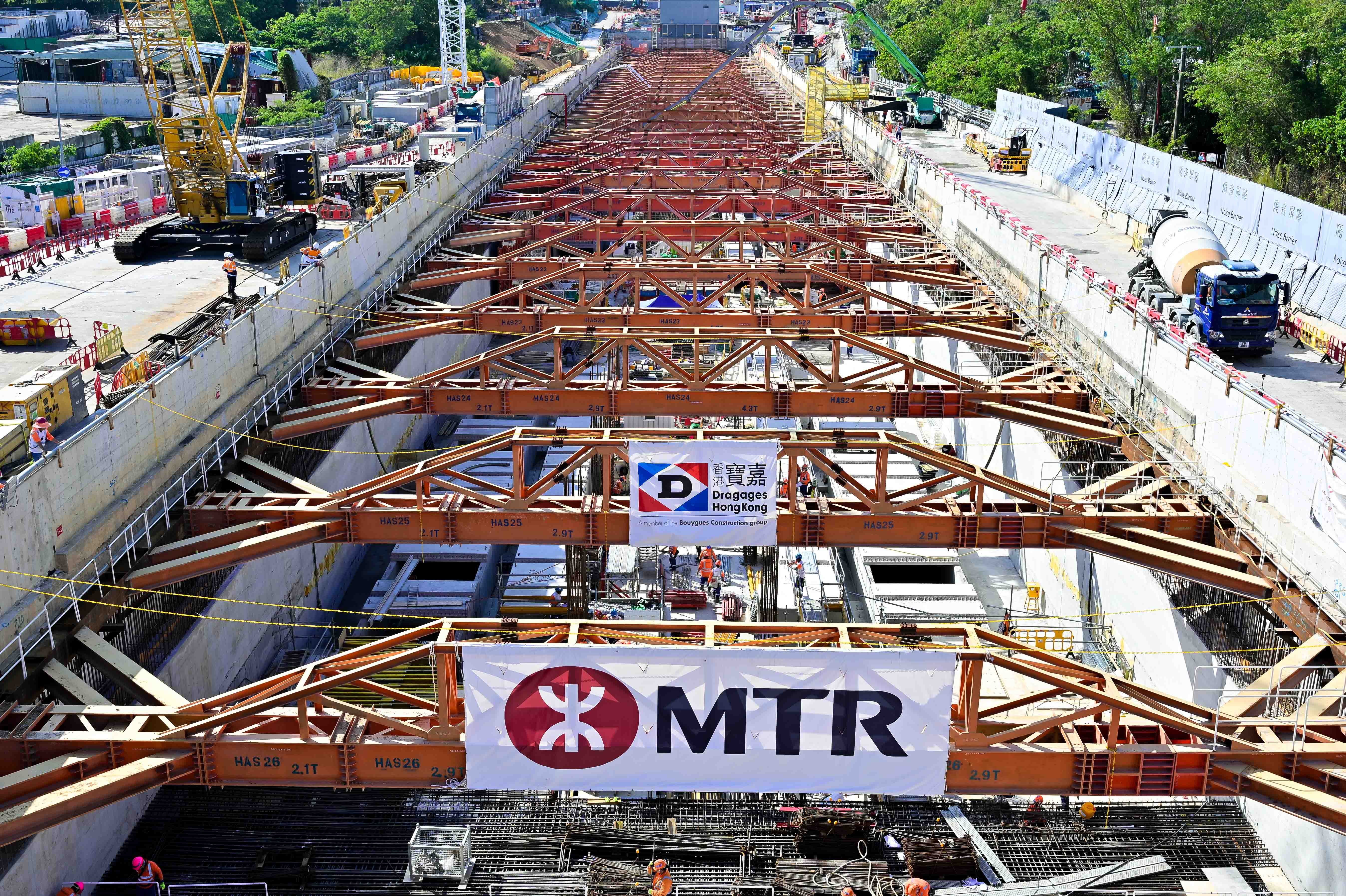 The construction of the station structure for Kwu Tung Station on the East Rail Line is progressing at full speed as planned. The concourse slab has been successfully completed and 28 metal supporting struts have been removed. This was followed by the commencement of Side Wall construction, marking a significant milestone as the construction of the station structure advances to the next stage!