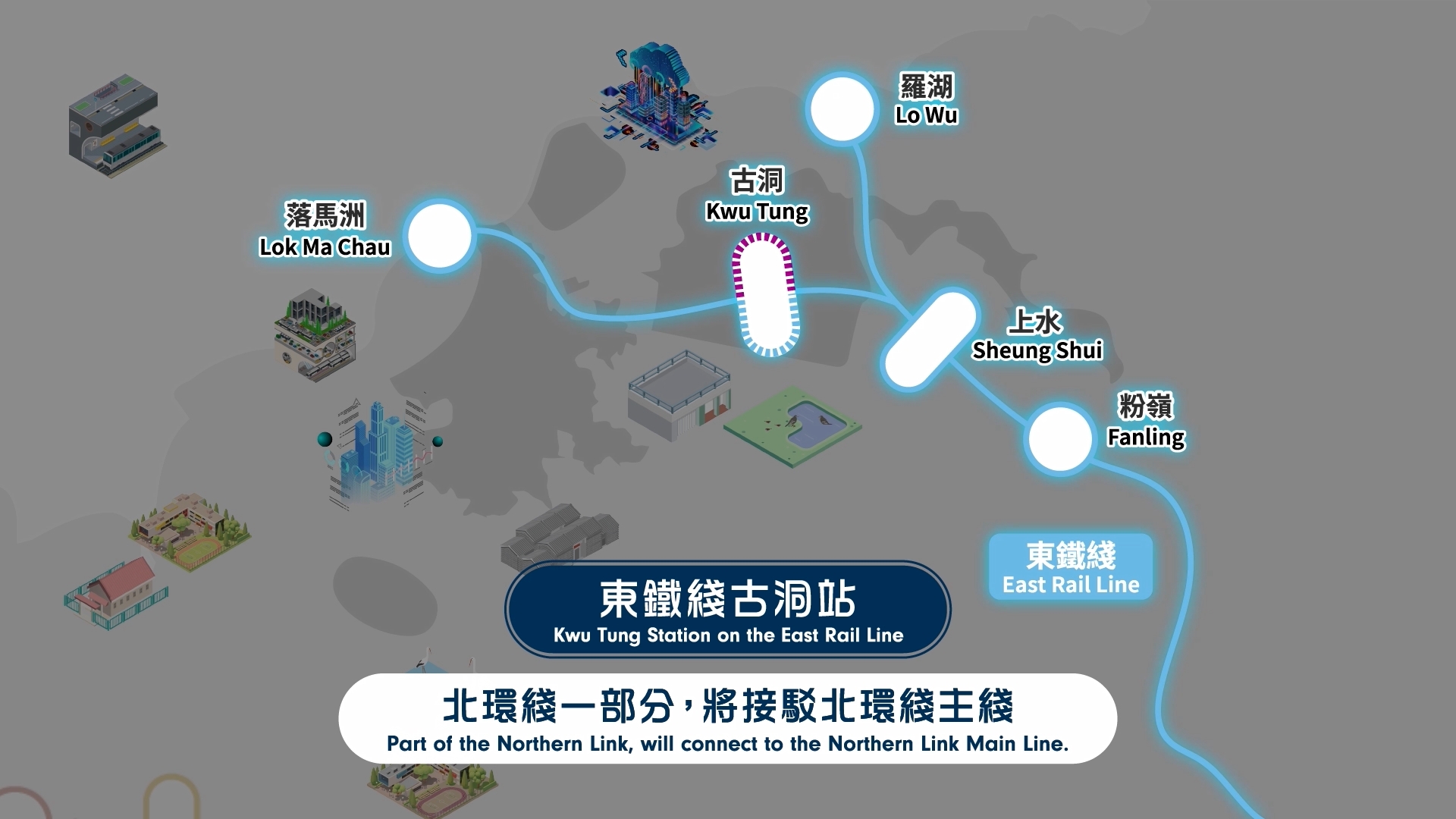 Between Lok Ma Chau and Sheung Shui stations, Kwu Tung Station on the East Rail Line will be located at the junction of the existing Ma Tso Lung Road and Ho Sheung Heung Road, which is also the town centre of the future Kwu Tung North New Development Area. Once the Northern Link is completed, Kwu Tung Station will be upgraded to an interchange station, allowing passengers to easily transfer between the East Rail Line and the Northern Link.
