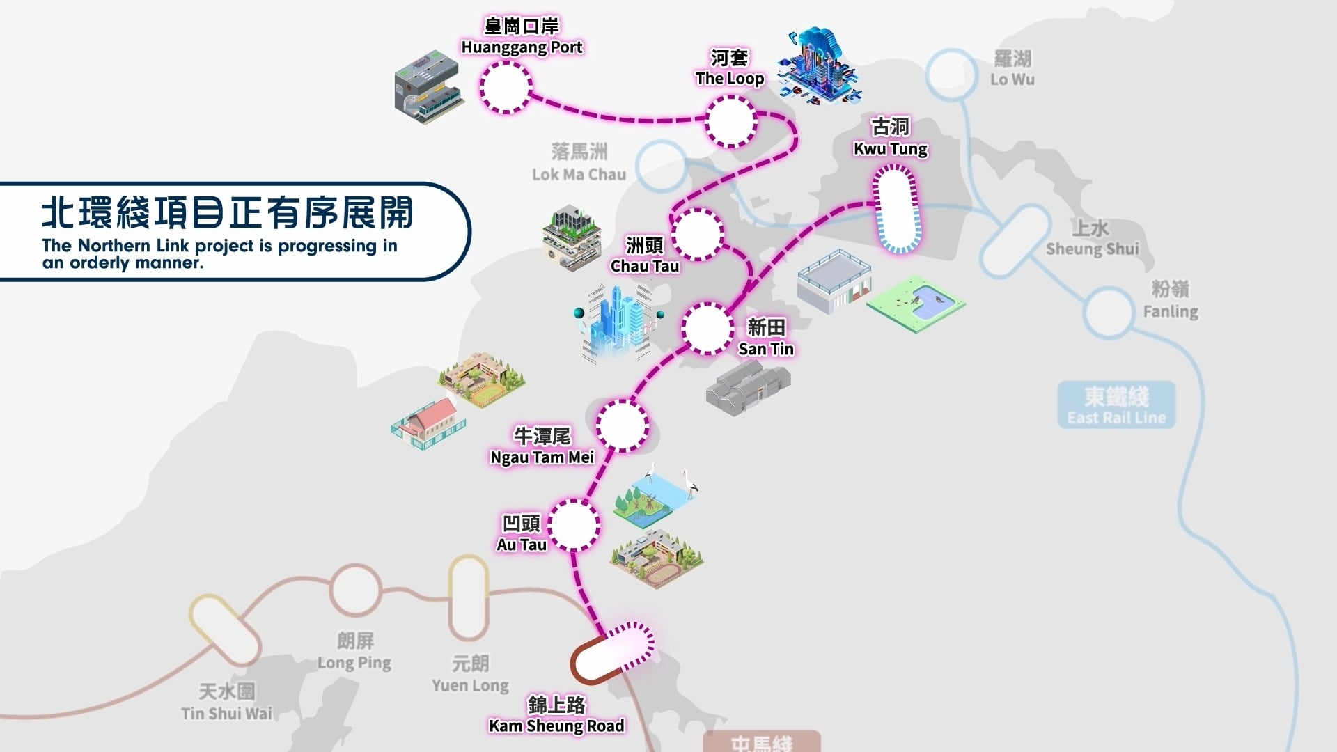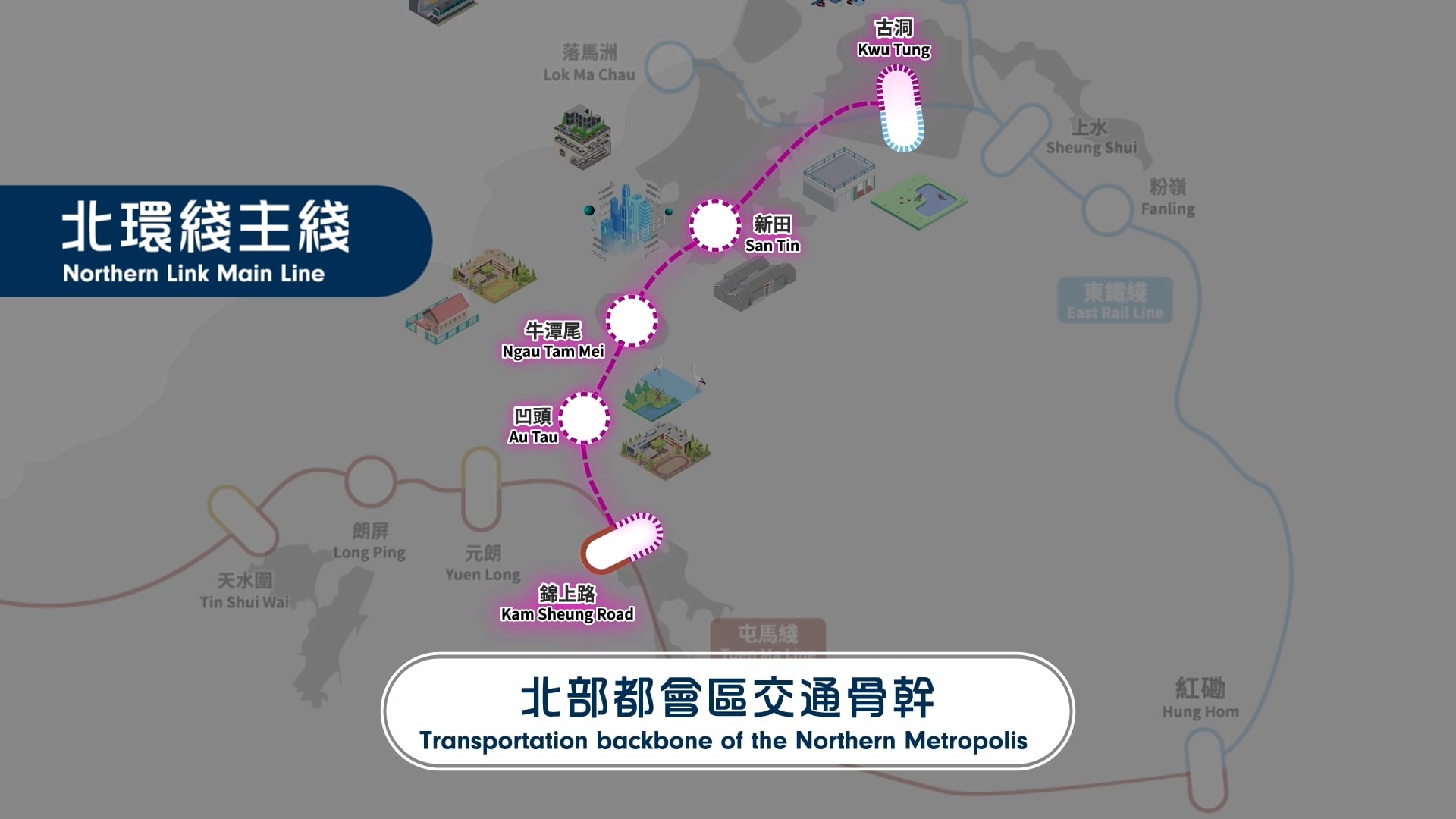 The Northern Link Main Line is a 10.7-km-long railway, linking the existing Kam Sheung Road Station of the Tuen Ma Line and the future Kwu Tung Station, with two terminal and three intermediate stations in San Tin, Ngau Tam Mei and Au Tau. It will provide efficient and reliable railway services in the Northern New Territories to meet the transport demand of new population along the railway alignment in the Northern Metropolis. It will also form a railway loop with the existing Tuen Ma Line and East Rail Line, thereby greatly improving the transport connectivity between New Territories East and New Territories West.