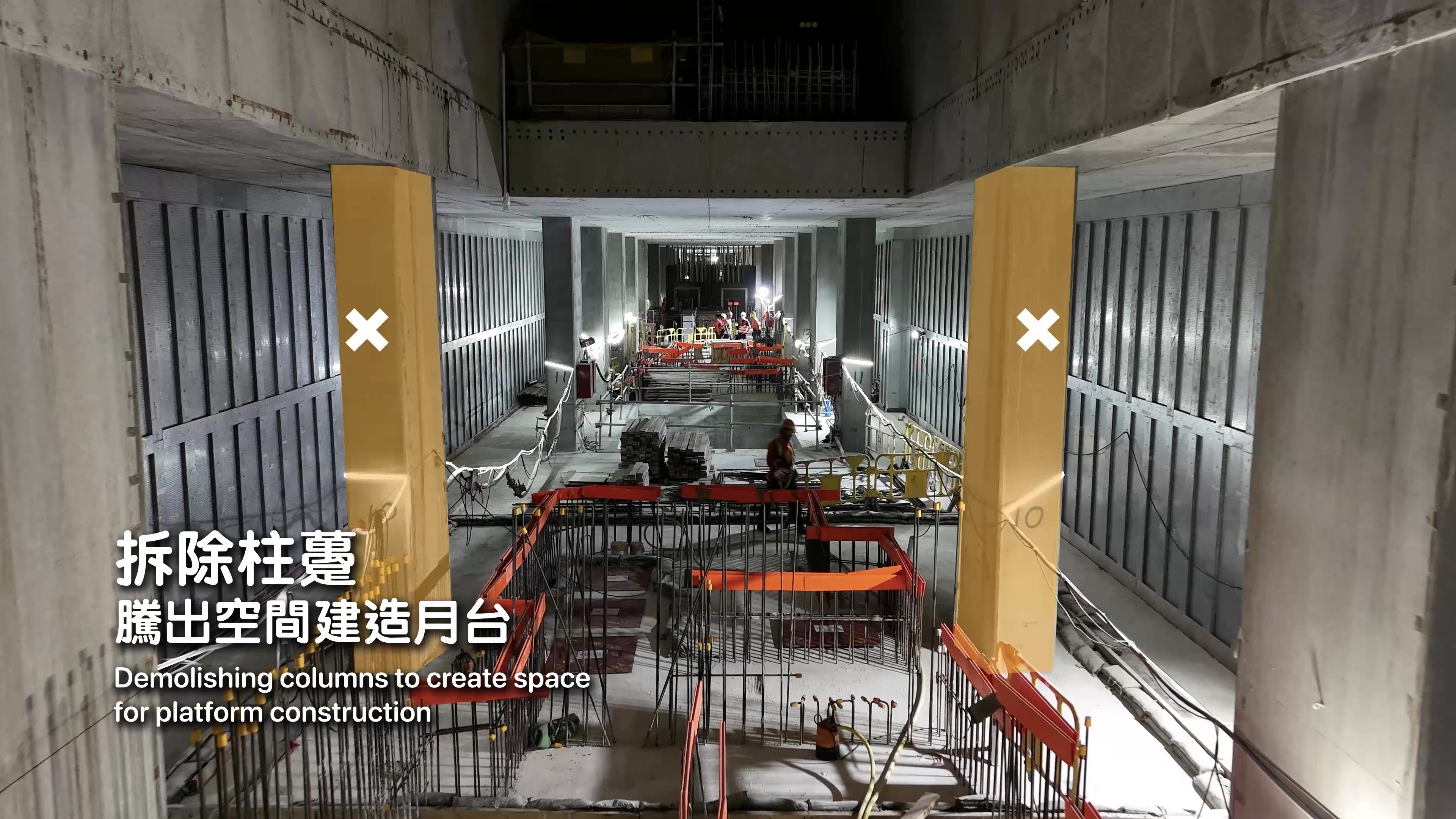 在當年興建落馬洲支綫時預留、深入地底約20米深的箱形隧道結構內豎立多條柱躉,用作穩定結構及抵銷地下水浮力。隨著整體車站結構工程的進度,工程團隊將19條、共重約60噸的柱躉拆除,以騰出空間進行月台改造工程。工程團隊以創新思維,將這些柱躉分3部分拆除,拆除後的柱躉會升級重用,成為月台層地面的一部分,其重量亦可以幫助維持箱形結構的穩定。
