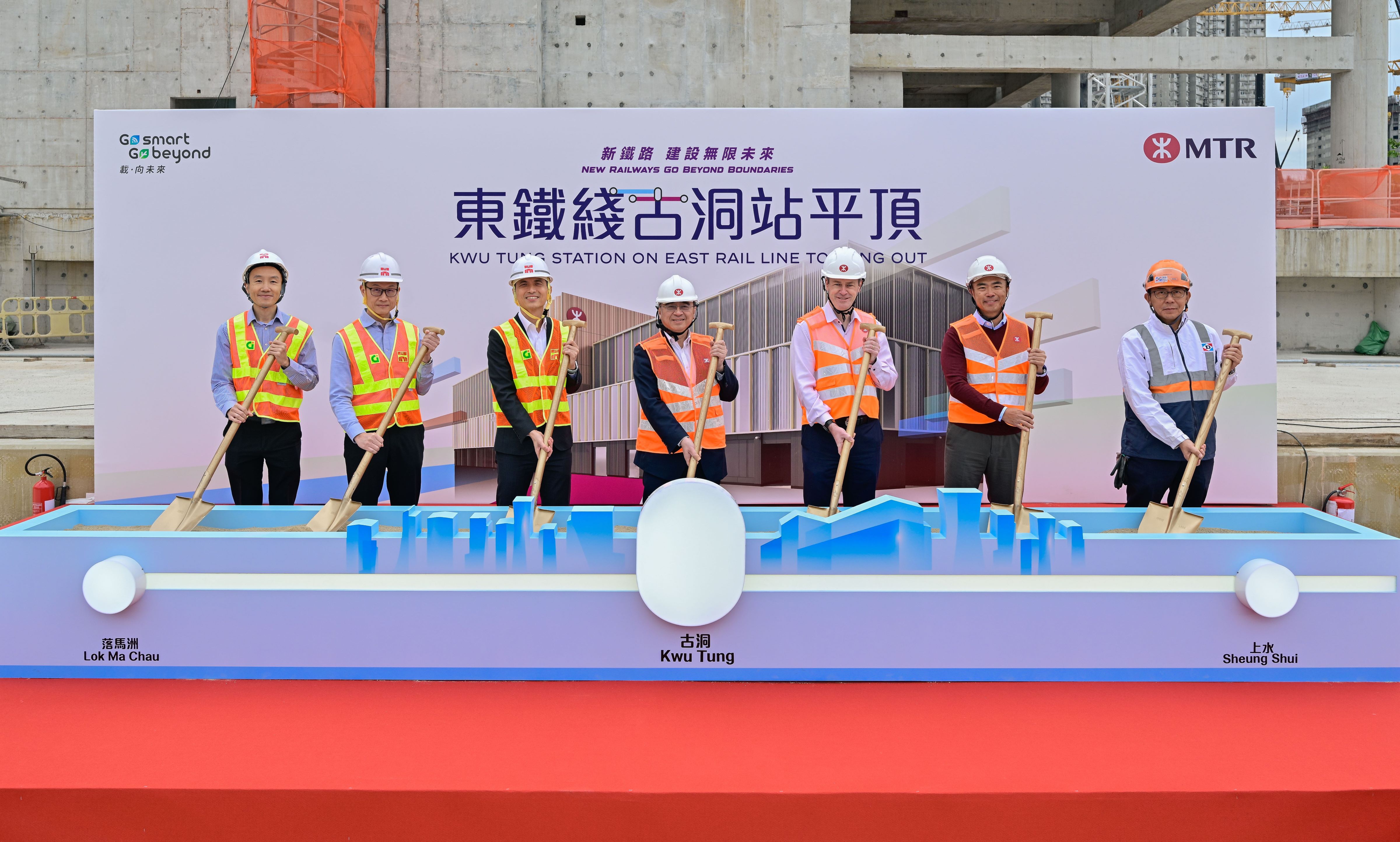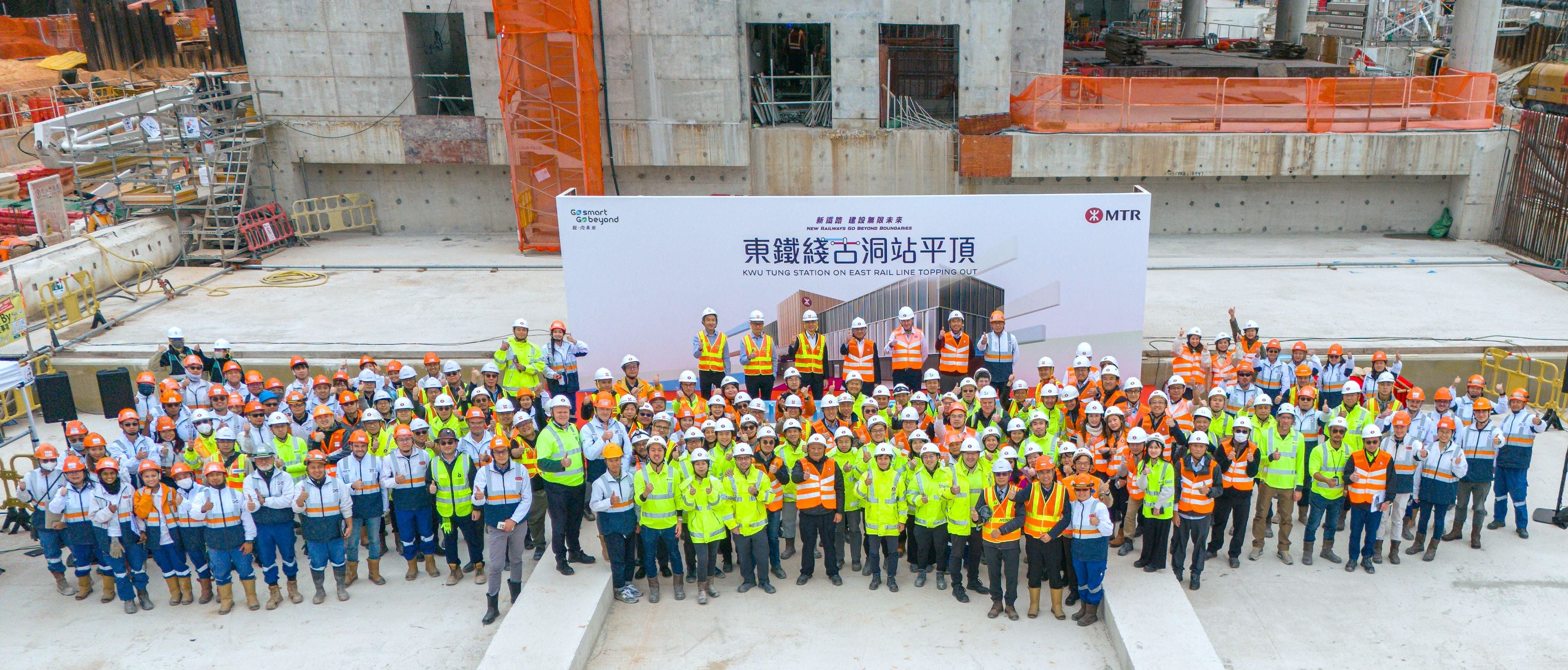 東鐵綫古洞站*的土木建造工程已大致完成,並於2025年11月19日舉行平頂儀式。行政總裁金澤培博士、項目及工程拓展總監鄧輝豪先生,聯同運輸及物流局常任秘書長丘卓恒先生及承建商代表等主持儀式,見證項目建設的重要里程碑。